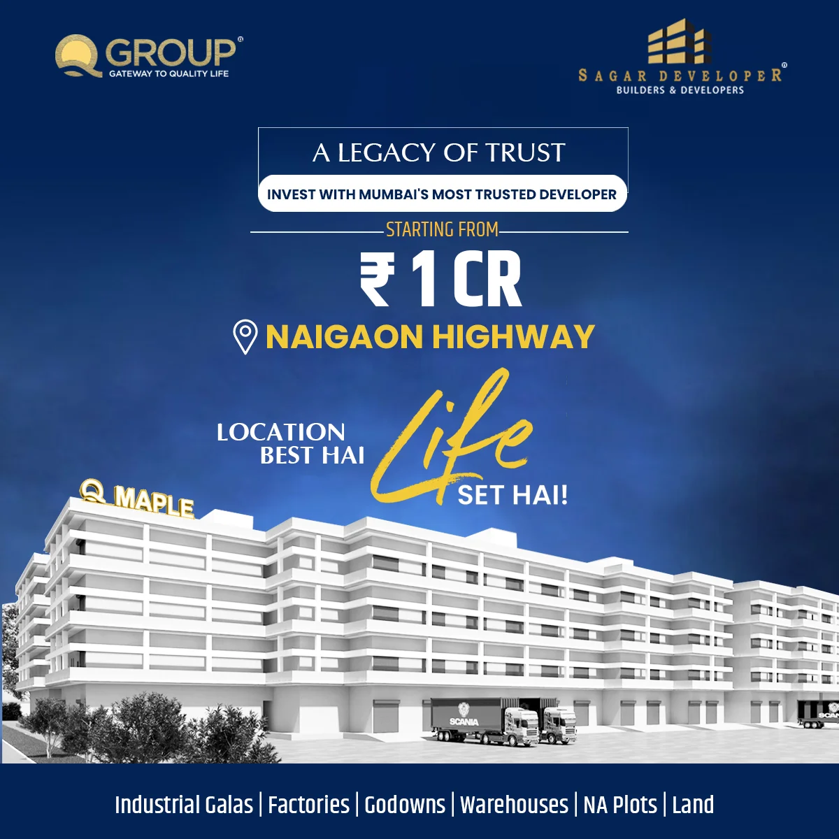 Sagar Developers presents premium VVCMC-approved industrial spaces in the thriving industrial belt of Naigaon–Vasai–Virar. Designed for functionality and long-term value, this project offers customizable galas, warehouses, factories, and sheds that cater to diverse business needs. Spread across a secure, well-planned campus with ready infrastructure, these spaces ensure smooth operations for manufacturing, storage, logistics, and other industrial activities. With excellent highway connectivity to Mumbai, Thane. The location offers unmatched convenience for supply chain and distribution.